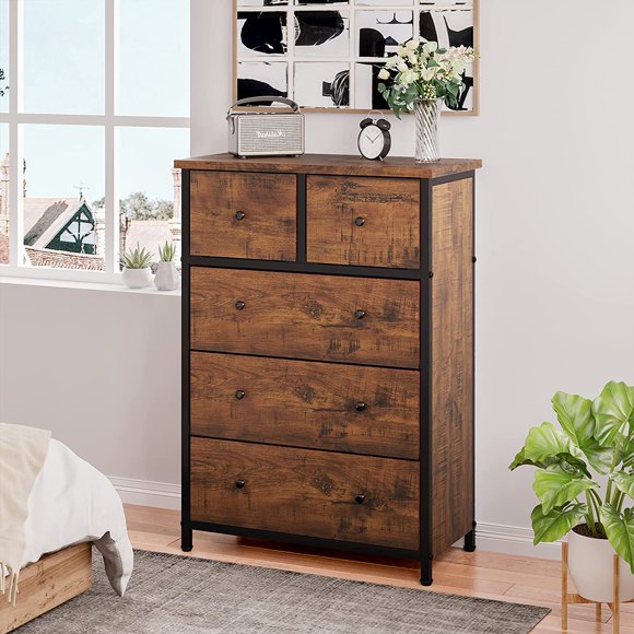Hasuit Dresser with 5 Drawers, Fabric Storage Chest Clothes Organizer, Sturdy Steel Frame, Wood Top & Side Panel, Easy Pull Handle, Large Storage Cabinet (Embossed Walnut)
